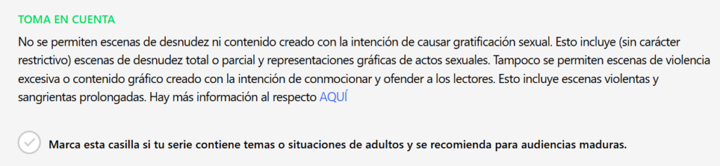 Lo que sí puede meterte en problemas es subir episodios que violen las políticas.Webtoon es estricto con: